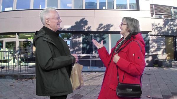 Unterhaltung zwischen zwei Leuten, die sich auf der Straße zufällig begegnen.